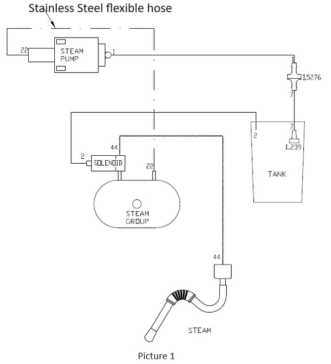 between the steam pump and the steam thermoblock. See Picture 1.