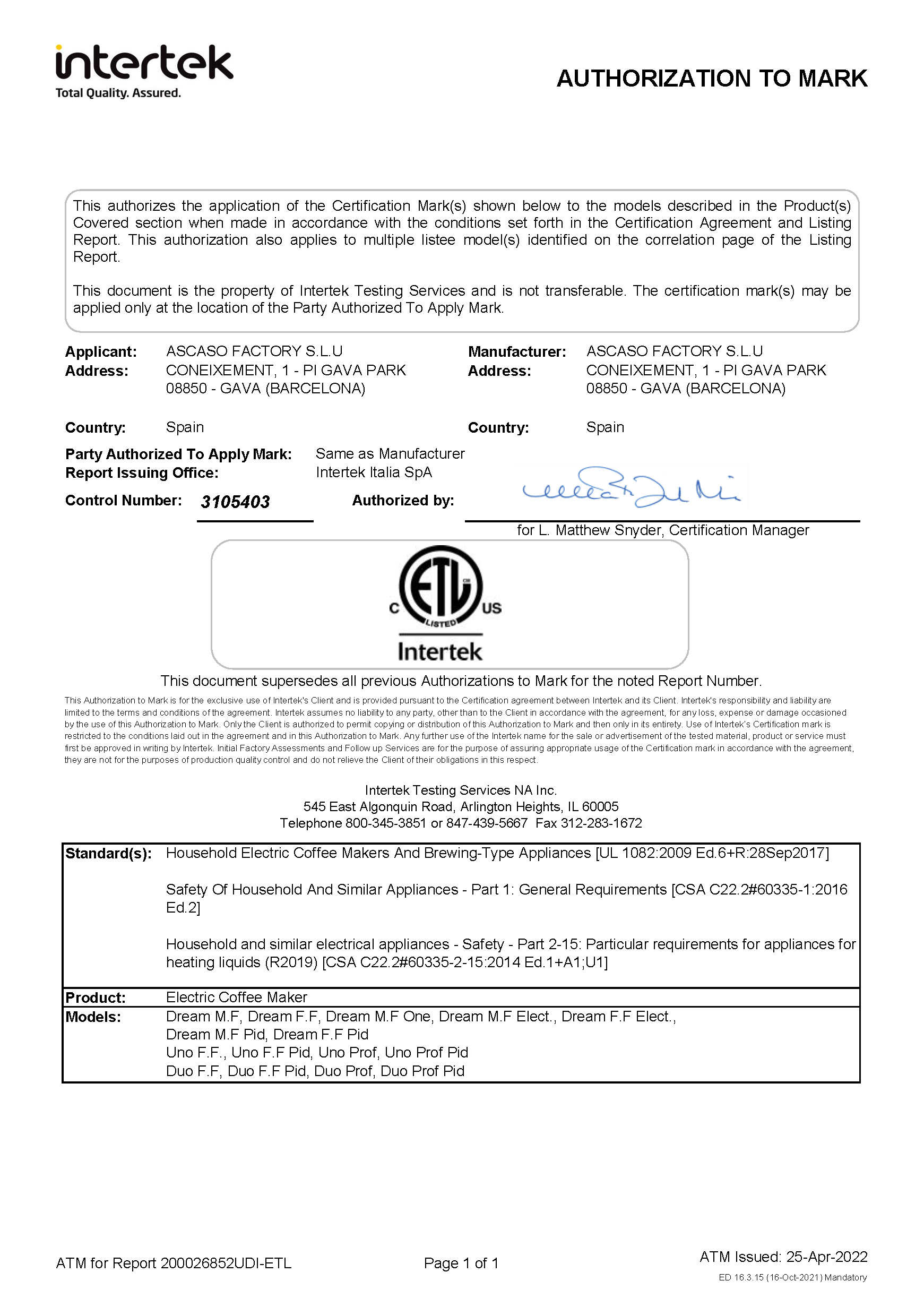 ETL Certificate for Ascaso Home Machines (all US ETL Certified models) ETL Certificate for Ascaso Home Machines (all US ETL Certified models)